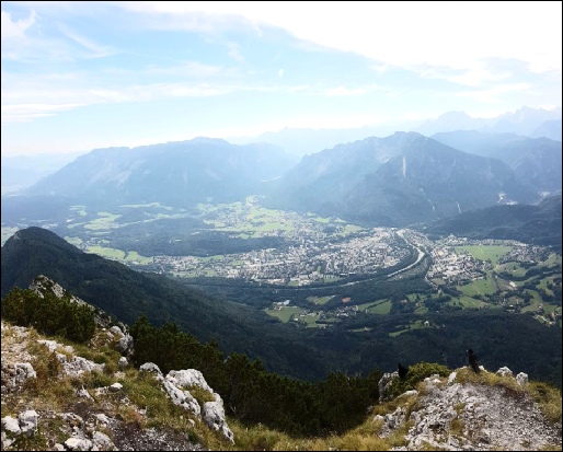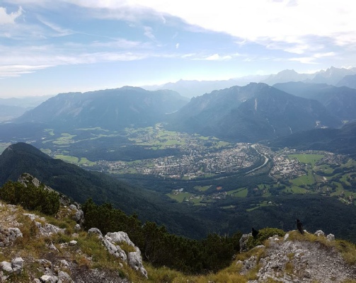 Mit wackeligen Knien, bin ich dann zur Hütte rauf und habe mir das er-sehnte Getränk bestellt. Ein grandi-oser Ausblick auf das Berchtesgadener Land, war die Belohnung für die durchaus ansprechende Wanderung. Auch der Blick auf den Watzmann war toll.