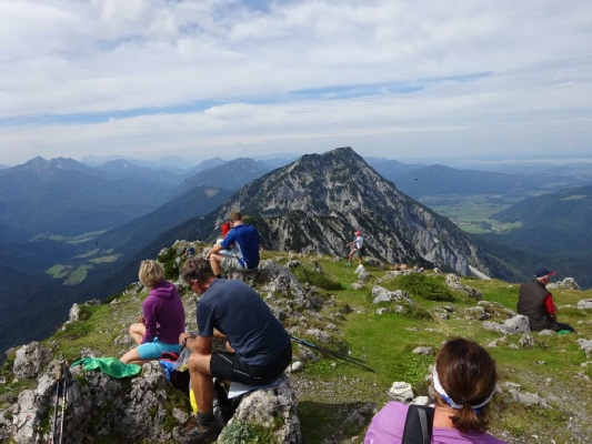 Dabei kam ich mir vor, wie eine lahme Schnecke. Immer wenn mich andere Wanderer eingeholt haben, tat ich so, als würde ich gerade ein Foto schies-sen. Der Weg war wie am Vortag wieder sehr steil und steinig. Am An-fang ging es immer in Serpentinen einen Waldhang hinauf. Als der Wald sich lichtete, hatte man einen sehr schönen Ausblick auf Bad Reichenhall und die umliegenden Berge. Von der Talsicht her, hat mir diese Tour schon mal besser gefallen, als die zum Watzmannhaus. Nach einem kurzen Stück im "Freien", ging es dann noch mal ein kleines Stück durch einen Wald. Als dieser endete, stand man dann vor dem finalen Anstieg, der direkt über den Bergrücken führte. Hier ging es zu beiden Seiten steil bergab, nichts für Leute mit Höhen-angst. Aber die Aussicht war so genial, man konnte hier jetzt in beide Richtungen schauen. Auf der einen Seite Bad Reichenhall und Richtung Norden der Blick auf das Alpenvor-land mit dem Chiemsee.