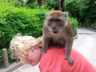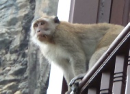 Es handelt sich dabei um Makaken, die meistens in Gruppen bis zu 40 Tieren durch die Anlage streiften. Dabei haben sie allerhand Schabernack getrieben. Wer seine Zimmertür nicht zugemacht hat, durfte sich nicht über einen ausgeräumten Kühlschrank wundern. Darüber haben wir uns dann köstlich amüsiert, bis man mag es kaum glauben, plötzlich bei uns zwei Exemplare im Zimmer standen! Tja, wer zuletzt lacht … Ich bin dann sofort rein, um die ungebetenen Gäste wieder nach draussen zu bugsieren. Aber die wollten das irgendwie nicht. Erst grinsten sie mich nur an, als ich etwas konkreter werden wollte, fletschten sie die Zähne! Puh, da bin ich aber fast in Panik geraten. Die Hauer sind nicht von schlechten Eltern. Vor Angst hab ich mir dann ein Bambusrohr geschnappt um sie auf Distanz zu halten. Erst nach ein paar Minuten haben sie sich dann verkrümmelt. Seitdem haben wir diesen Affen „Fletscher“ genannt.